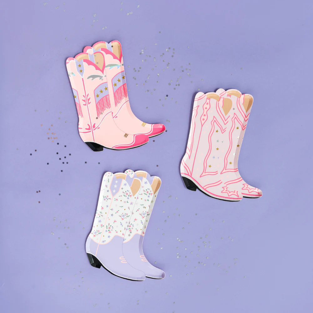 Calling all cowgirls! Our "Pony Tales" collection has everything you need to gear up for your next rodeo. These cowgirl boot plates feature pink and purple boots trimmed with gold and silver foil details. This plate set includes 4 different designs. Illustrated by the Daydream Society